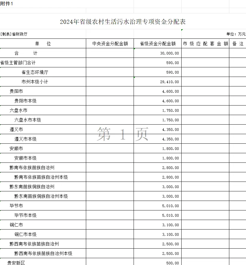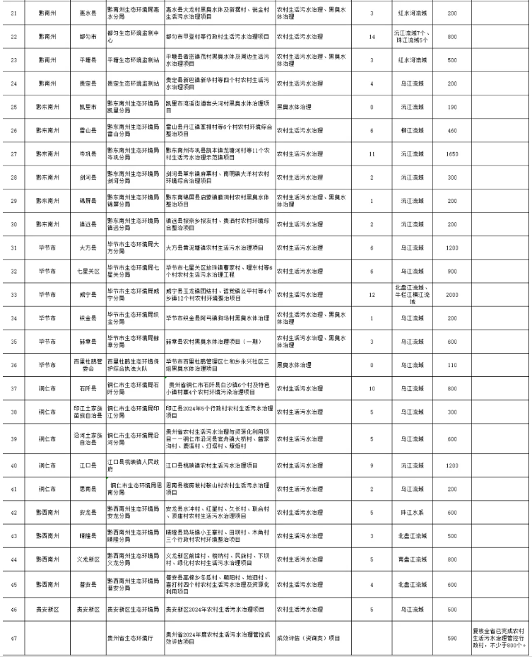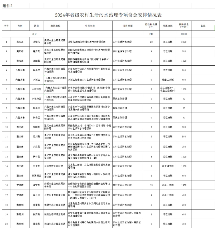 貴州省財(cái)政廳、貴州省生態(tài)環(huán)境廳發(fā)布關(guān)于下達(dá)2024年省級(jí)農(nóng)村生活污水治理專(zhuān)項(xiàng)資金的通知,下達(dá)2024年省級(jí)農(nóng)村生活污水治理專(zhuān)項(xiàng)資金30000萬(wàn)元,用于支持240個(gè)行政村農(nóng)村生活污水治理、12條黑臭水體治理。