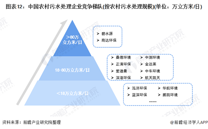 根據(jù)企業(yè)的農(nóng)村污水處理總規(guī)模劃分,可分為三個(gè)梯隊(duì),第一梯度為農(nóng)村污水處理總規(guī)模在80萬(wàn)立方米/日以上的企業(yè),有碧水源、商達(dá)環(huán)保。第二梯隊(duì)為農(nóng)村污水處理總規(guī)模在18-80萬(wàn)立方米/日以上的企業(yè),包括桑德環(huán)境、正清環(huán)保、愛(ài)迪曼、金達(dá)萊、深港環(huán)保、中車(chē)環(huán)境、中測(cè)環(huán)境和航天凱天。第三梯隊(duì)為農(nóng)村污水處理總規(guī)模在小于18萬(wàn)立方米/日的企業(yè),代表性企業(yè)有泓濟(jì)環(huán)保、華航環(huán)境、藍(lán)神環(huán)保、鵬凱環(huán)境等。