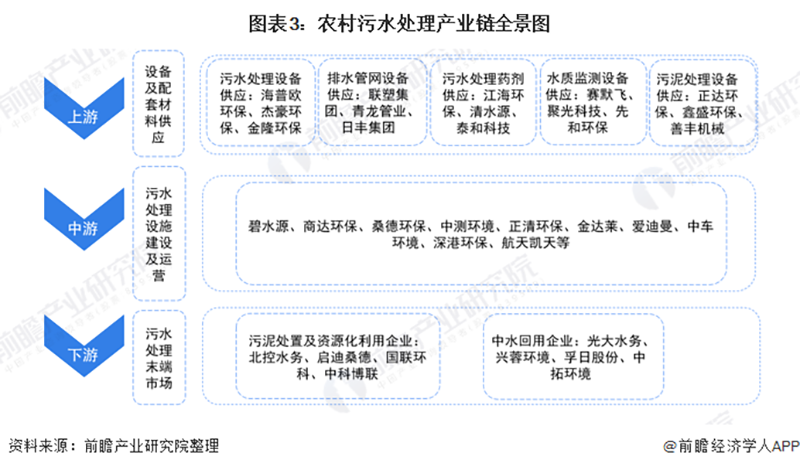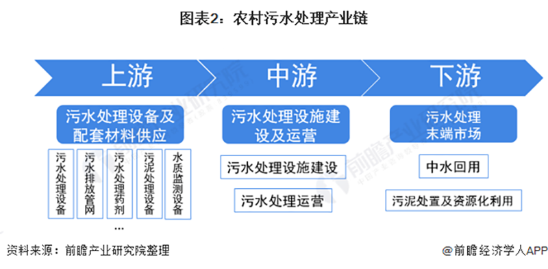 農(nóng)村污水處理行業(yè)上游供應(yīng)商一般為污水處理設(shè)備及配套材料供應(yīng);中游主要是農(nóng)村污水處理設(shè)施建設(shè),以及農(nóng)村污水處理設(shè)施建設(shè)后的運(yùn)營(yíng)、管理、監(jiān)督、維護(hù)以及其他管理性質(zhì)工作,如污水處理設(shè)施的服務(wù)外包,多種形式的委托經(jīng)營(yíng)等;下游為污水處理末端市場(chǎng),如中水回用、污泥處置及資源化利用等。