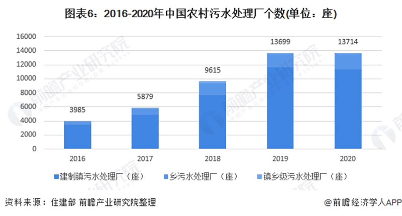 從污水處理基礎(chǔ)設(shè)施建設(shè)方面看,“十三五”期間我國(guó)農(nóng)村污水處理廠數(shù)量規(guī)??焖僭鲩L(zhǎng),截至2020年底,我國(guó)共有農(nóng)村污水處理廠13714座,其中建制鎮(zhèn)污水處理廠數(shù)量11374座,鄉(xiāng)污水處理廠2170座,鎮(zhèn)鄉(xiāng)級(jí)區(qū)域污水處理廠170座。