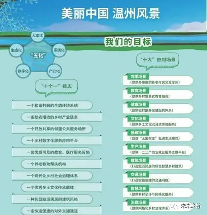 以“五化”為方向,"十個(gè)一”為標(biāo)志,聚焦“十大"應(yīng)用場(chǎng)景,2021年先行啟動(dòng)25個(gè)未來(lái)鄉(xiāng)村試點(diǎn),計(jì)劃到2025年全市創(chuàng)成100個(gè)以上未來(lái)鄉(xiāng)村,使未來(lái)鄉(xiāng)村真正成為美麗中國(guó)的溫州風(fēng)景。