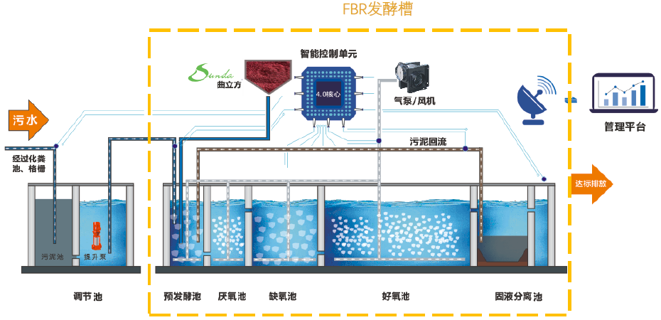 FBR發(fā)酵槽是EEM菌技術(shù)應(yīng)用的核心設(shè)備。一直以來,針對(duì)農(nóng)村污水的處理技術(shù)缺乏對(duì)處理系統(tǒng)核心的認(rèn)識(shí),各種生物處理工藝對(duì)起主導(dǎo)功能作用的微生物認(rèn)識(shí)不足,應(yīng)用方式仍處于比較低端的自然發(fā)生狀態(tài)(如控制溶氧、回流、外加碳源等),特別是當(dāng)前一些商業(yè)化菌劑或菌液產(chǎn)品普遍采用直接投加,但這種簡單接入方式容易導(dǎo)致功能微生物快速流失、周期短、抗沖擊能力差且應(yīng)用成本較高,極大限制了微生物處理效率,難以實(shí)現(xiàn)農(nóng)村污水的低成本處理模式。因此為了解決這一難點(diǎn),商達(dá)技術(shù)性創(chuàng)新首次在農(nóng)村污水處理領(lǐng)域引入了微生物現(xiàn)代發(fā)酵過程技術(shù)理念,開發(fā)了以FAAO預(yù)發(fā)酵工藝技術(shù)為核心的EEM菌技術(shù)專用FBR發(fā)酵槽,EEM菌快速形成優(yōu)勢菌群,持續(xù)維持EEM菌的高活性、高豐度,顯著增強(qiáng)污水處理系統(tǒng)的生態(tài)穩(wěn)定性和抗沖擊性,為實(shí)現(xiàn)農(nóng)村污水低成本處理邁出了關(guān)鍵一步。