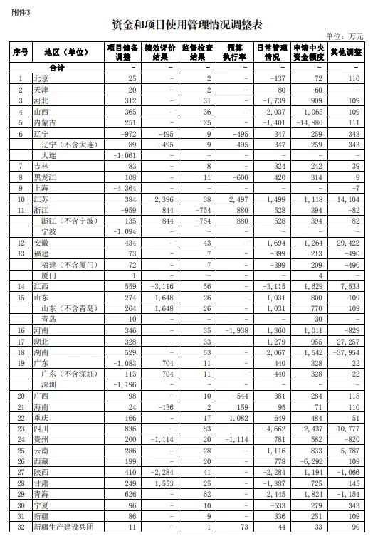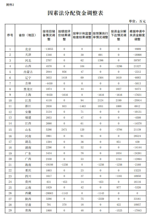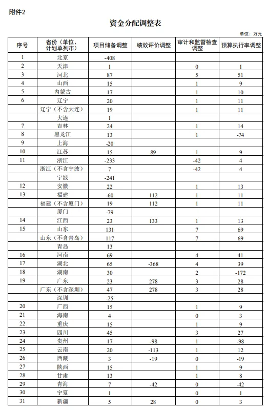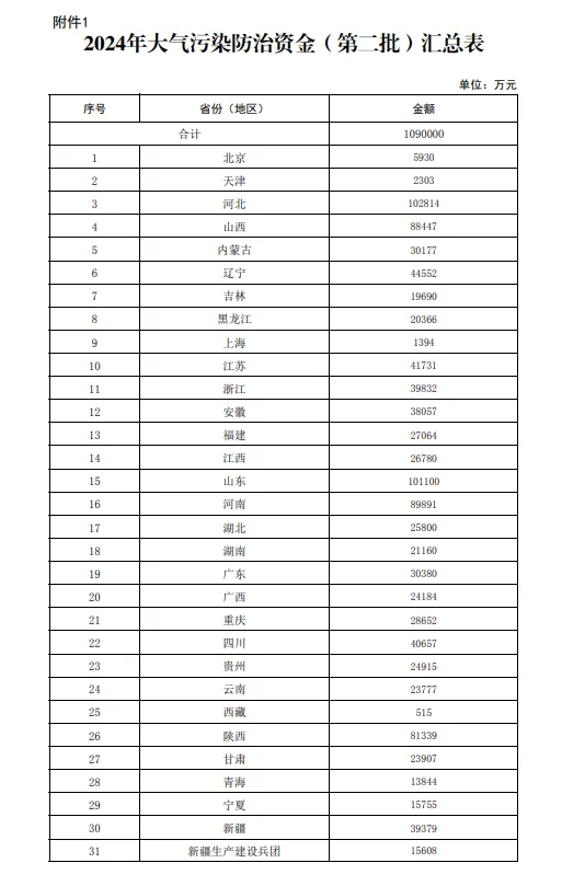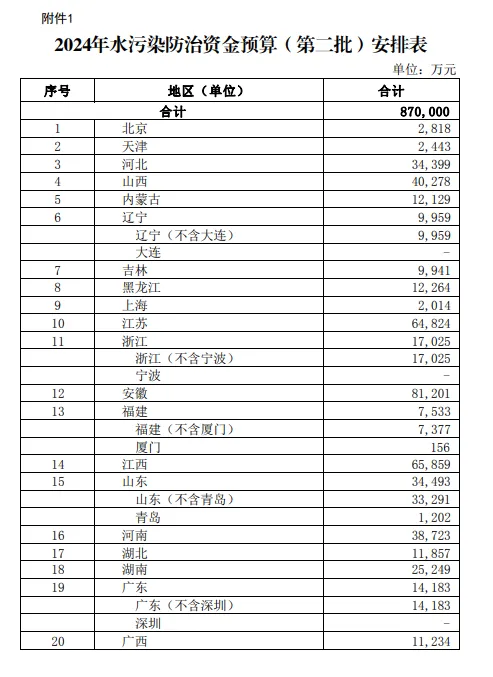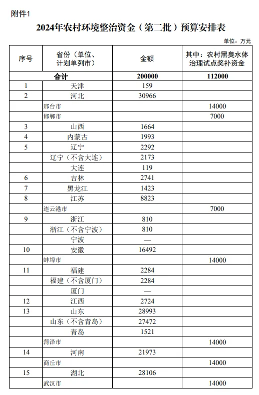 財政部關于下達2024年度大氣污染防治資金(第二批)預算的通知有關省、自治區(qū)、直轄市財政廳(局),新疆生產建設兵團財政局: 為支持大氣污染防治工作,促進大氣質量改善,現(xiàn)下達你省(自治區(qū)、直轄市、新疆生產建設兵團,以下簡稱省)2024年大氣污染防治資金,用于支持開展減污降碳等方面相關工作,并就有關事項通知如下: 一、各省安排金額見附件1,項目支出列2024年政府收支分類科目“211 節(jié)能環(huán)保支出”,項目代碼:10000014Z145060020001。 二、各省要按照《財政部關于修改<大氣污染防治資金管理辦法>的通知》(財資環(huán)〔2022〕106號)等規(guī)定,加強資金管理,專款專用,切實提高資金使用效益。按照“資金跟著項目走”的原則,做好項目儲備工作,盡快形成有效投資,避免“資金等項目”。對已從中央基建投資等其他渠道獲得中央財政資金支持的項目,不得納入防治資金支持范圍。 三、為進一步加強預算績效管理,請按照《中共中央 國務院關于全面實施預算績效管理的意見》的要求,對照下達的績效目標組織開展績效運行監(jiān)控,做好績效評價。同時,將你省績效目標及時對下分解,分解下達績效目標要同時抄送財政部有關監(jiān)管局。中央財政分配資金時,根據各地項目儲備情況、績效評價結果、審計和監(jiān)督檢查結果、預算執(zhí)行率和資金分解下達情況對轉移支付作了適當扣減,請你省在分配資金時,比照中央財政的做法,加強績效評價結果應用,突出獎優(yōu)罰劣,切實提高財政資金效益。 財政部關于下達2024年農村環(huán)境整治資金(第二批)預算的通知各省、自治區(qū)、直轄市、計劃單列市財政廳(局),新疆生產建設兵團財政局: 為促進農村生態(tài)環(huán)境質量改善,加快推進農村環(huán)境整治工作,現(xiàn)下達你省(自治區(qū)、直轄市及新疆生產建設兵團,以下統(tǒng)稱?。?024年農村環(huán)境整治資金(第二批),并就有關事項通知如下: 一、各省安排金額見附件1,項目代碼:10000017Z175060020003,支出列2024年政府收支分類科目“211節(jié)能環(huán)保支出”。 二、資金分配突出獎優(yōu)罰劣原則。對績效評價結果排名靠后的相關省扣減資金,相應獎勵結果排名靠前的省;對資金執(zhí)行率靠后以及監(jiān)督檢查存在問題的相關省扣減資金,獎勵給其他省,詳見附件2。 三、請按照《財政部關于印發(fā)<農村環(huán)境整治資金管理辦法>的通知》(財資環(huán)〔2021〕43號)等有關要求,將資金預算盡快落實到具體項目,切實提高資金使用效益。對已從中央基建投資等其他渠道獲得中央財政資金支持的項目,不得納入資金支持范圍。 四、本次下達資金包含2024年農村黑臭水體治理試點資金額度的70%。請進一步加強項目管理,抓緊推動農村黑臭水體治理工作,強化試點全過程監(jiān)管和實施情況調度,切實提高項目進度和預算執(zhí)行率。項目實施過程中重大問題及時上報。