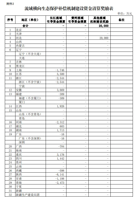 財政部關于下達2024年水污染防治資金預算(第二批)的通知各省、自治區(qū)、直轄市、計劃單列市財政廳(局),新疆生產建設兵團財政局: 為促進水環(huán)境質量改善,加快推進水污染防治工作,現(xiàn)下達你?。ㄗ灾螀^(qū)、直轄市、新疆生產建設兵團、計劃單列市,以下統(tǒng)稱省)2024年水污染防治資金(第二批),用于支持水污染防治和水生態(tài)環(huán)境保護等方面工作,并就有關事項通知如下: 一、各省安排金額見附件1,項目代碼:10000015Z155110010004,支出列2024年政府收支分類科目“211節(jié)能環(huán)保支出”。 二、各省要按照《財政部關于印發(fā)<水污染防治資金管理辦法>的通知》(財資環(huán)〔2021〕36號)有關規(guī)定,加強資金管理,??顚S?,切實提高資金使用效益。落實生態(tài)環(huán)保項目儲備制度有關要求,按照“資金跟著項目走”的原則,做好項目儲備工作,盡快形成有效投資,避免“資金等項目”。對已從中央基建投資等其他渠道獲得中央財政資金支持的項目,不得納入防治資金支持范圍。 三、此次下達資金對建立起橫向生態(tài)保護補償機制且完成年度清算的四川省、重慶市、湖北省、湖南省、江西省、安徽省、江蘇省分別給予獎勵,獎勵資金從其他未建立起機制的省份中扣減。同時,對河北省、北京市簽訂潮白河流域補償協(xié)議,積極推動流域橫向生態(tài)保護補償機制建設給予肯定和鼓勵,后續(xù)將視省級資金清算情況進行獎勵支持。各省要按照相關文件要求,積極主動開展合作,加快與鄰近省建立機制,已獲得獎勵資金的省份要推動建立長效機制。 四、各地要強化績效結果應用,中央財政在分配資金時,對審計和監(jiān)督檢查發(fā)現(xiàn)問題、績效評價結果差、預算支出進展慢的省份作了適當扣減,請你省在分配資金時,比照中央財政的做法,加強績效評價結果應用,突出獎優(yōu)罰劣,切實提高財政資金效益。 2.流域橫向生態(tài)保護補償機制建設資金清算獎勵表